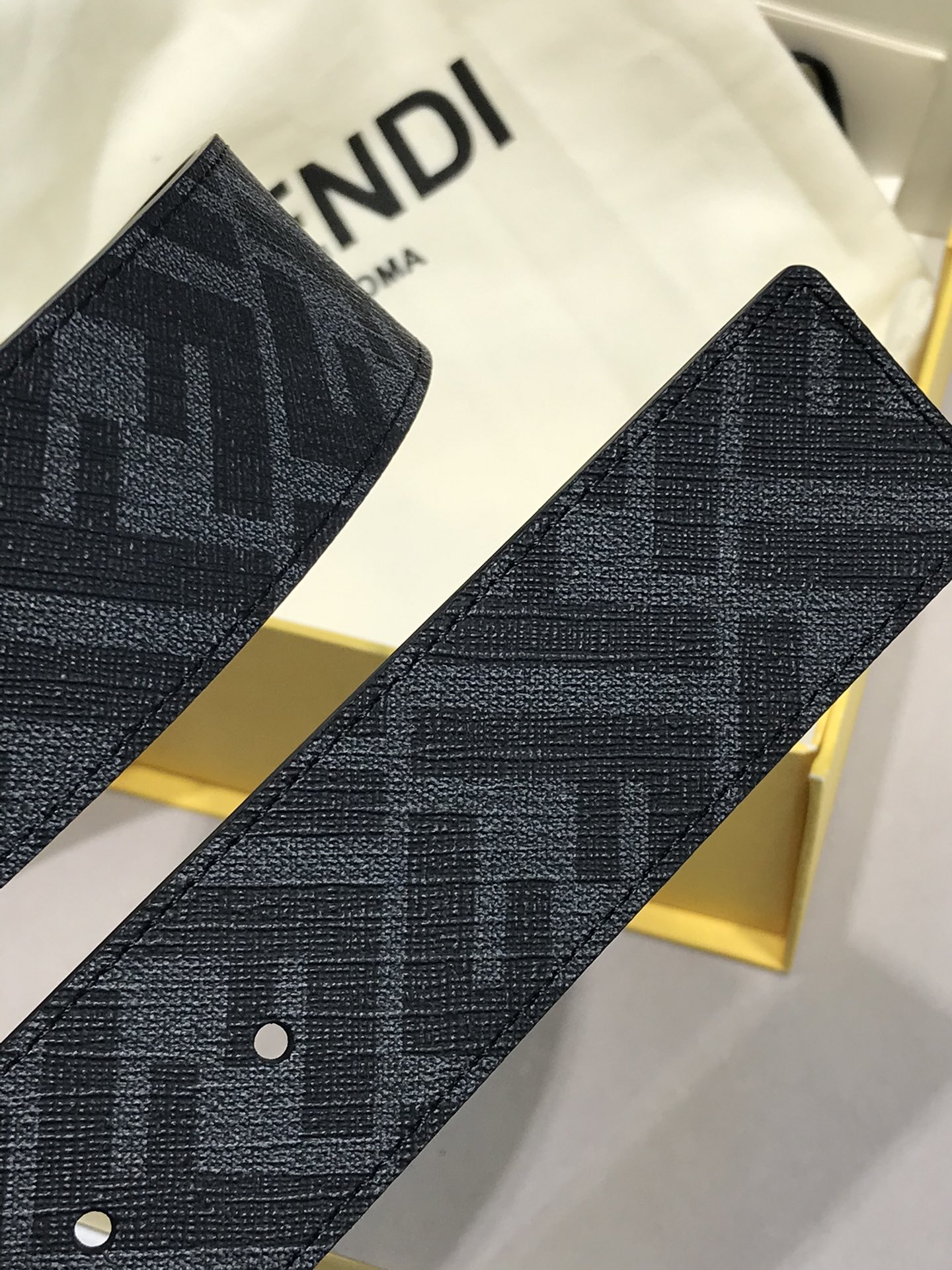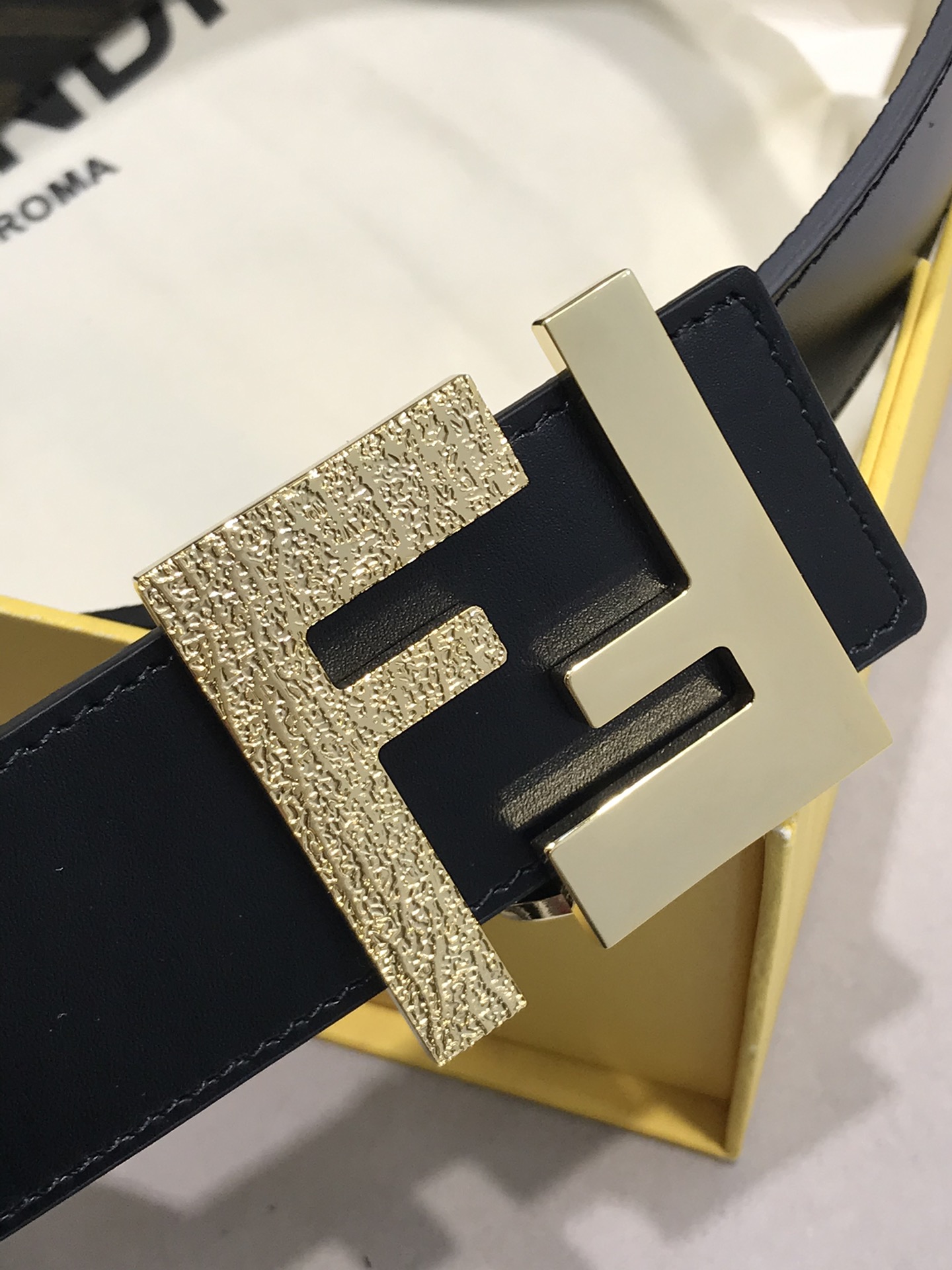 Logo shaped belt, glossy F rivet buckle.