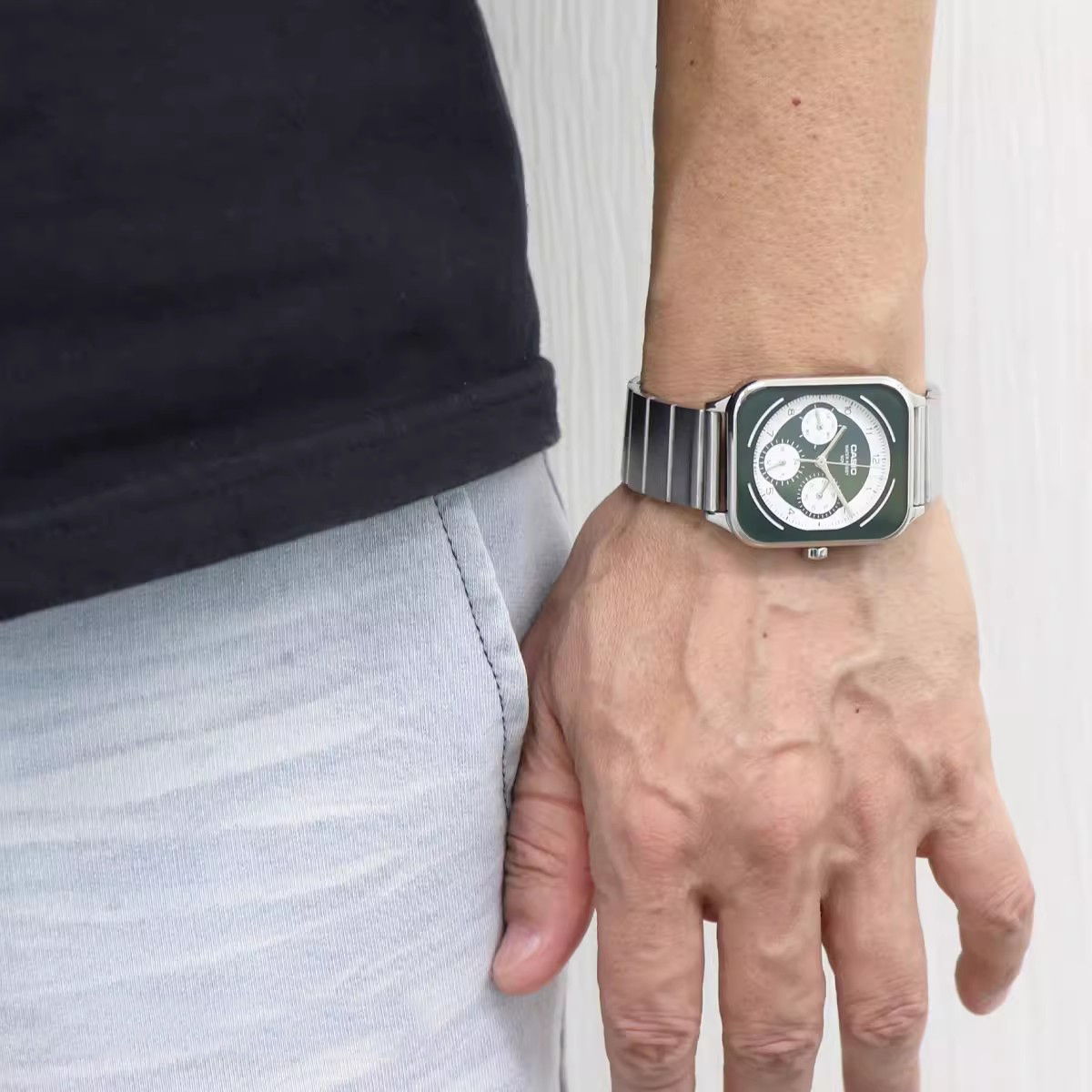 进口机芯,走时精准。方形表盘,时尚大气。不锈钢表带。